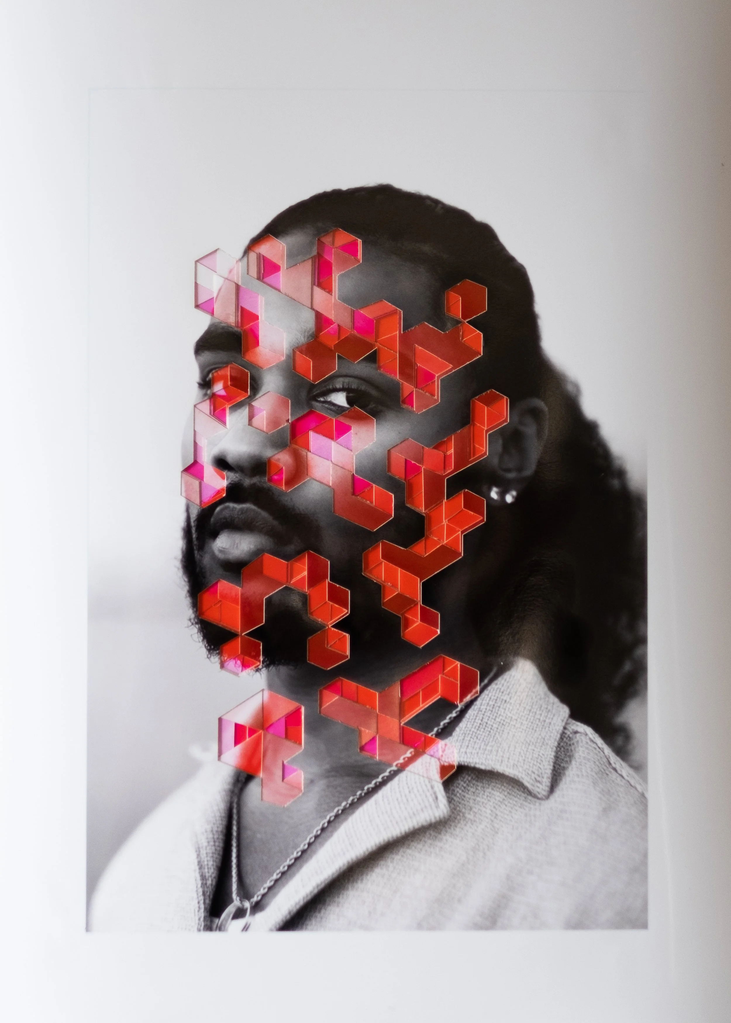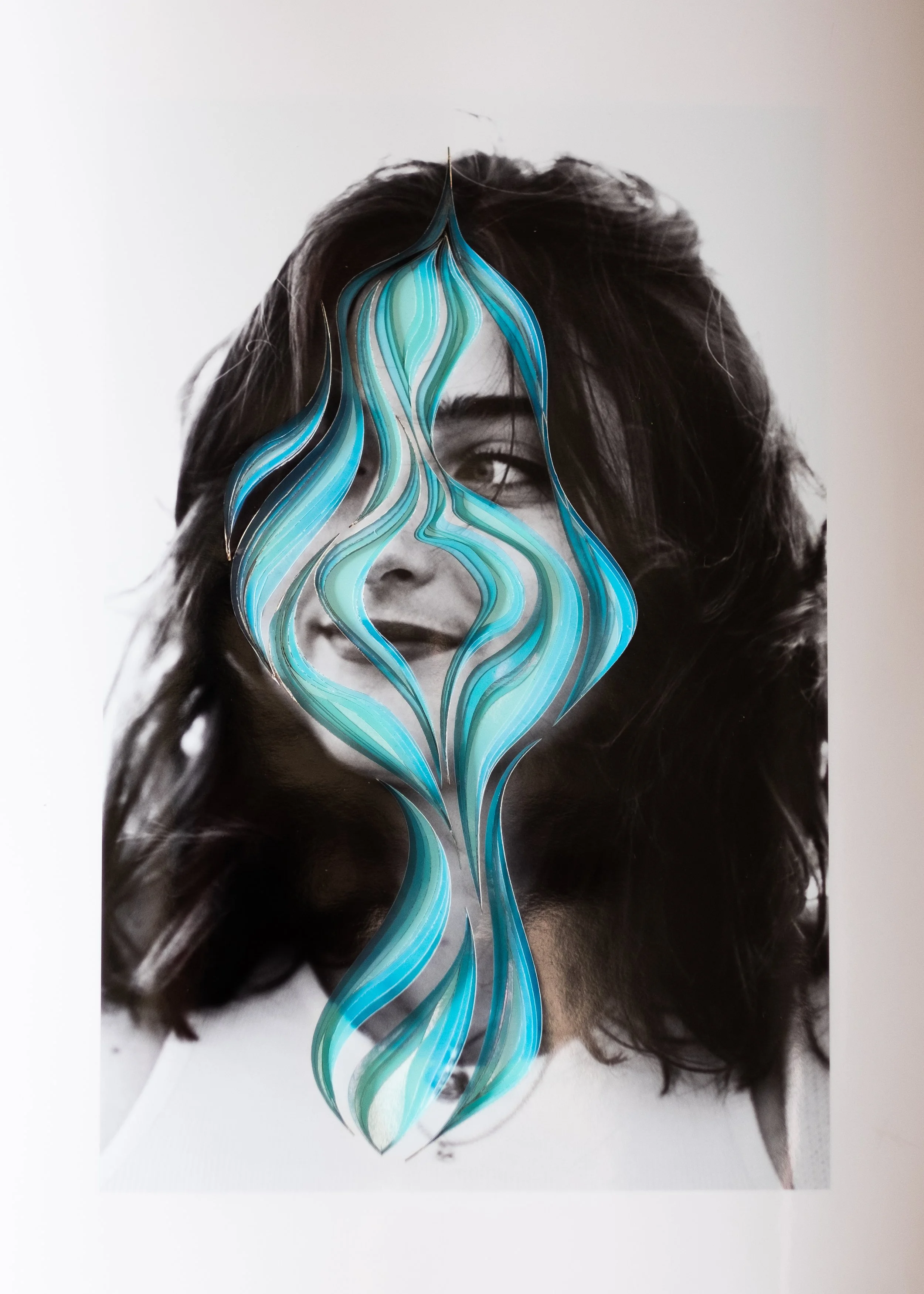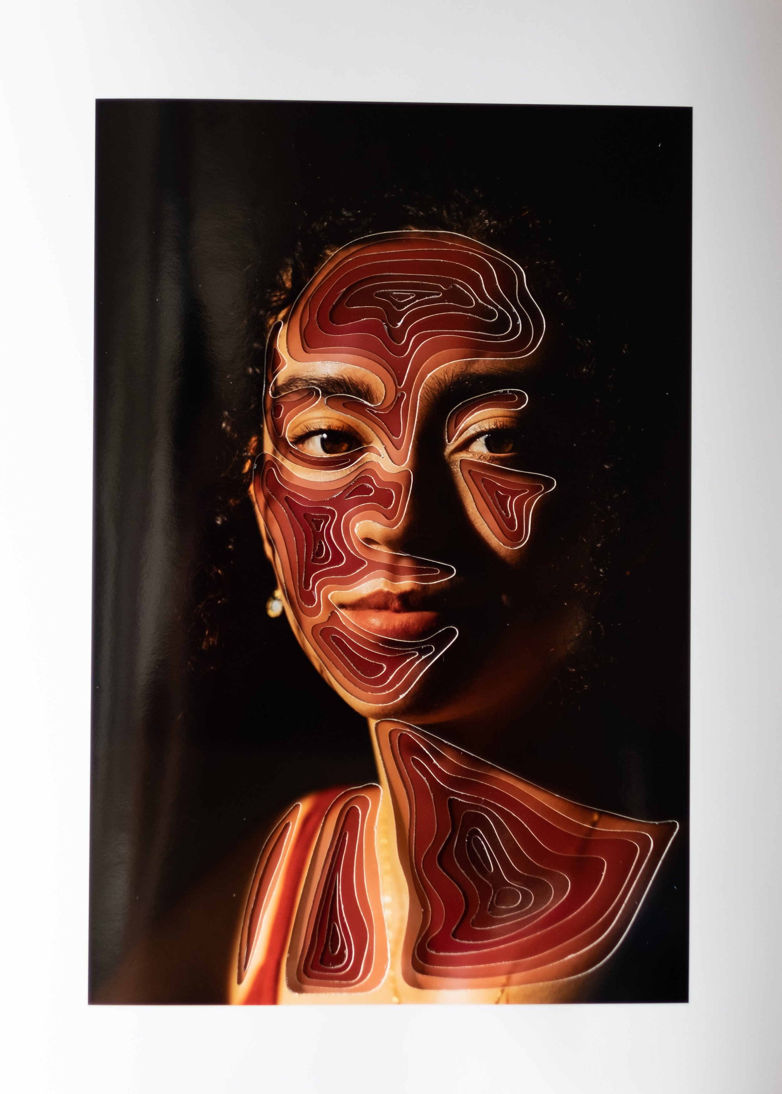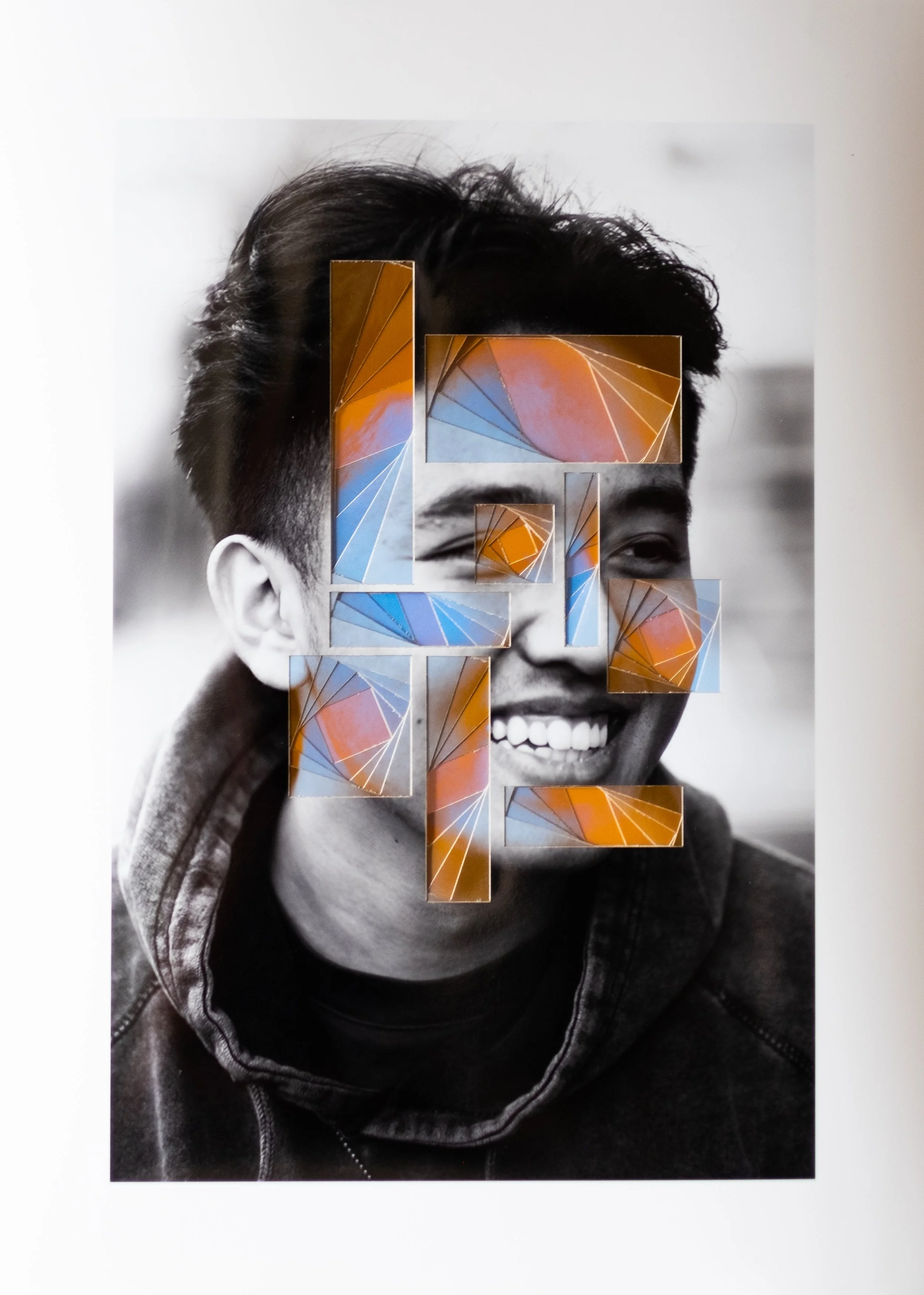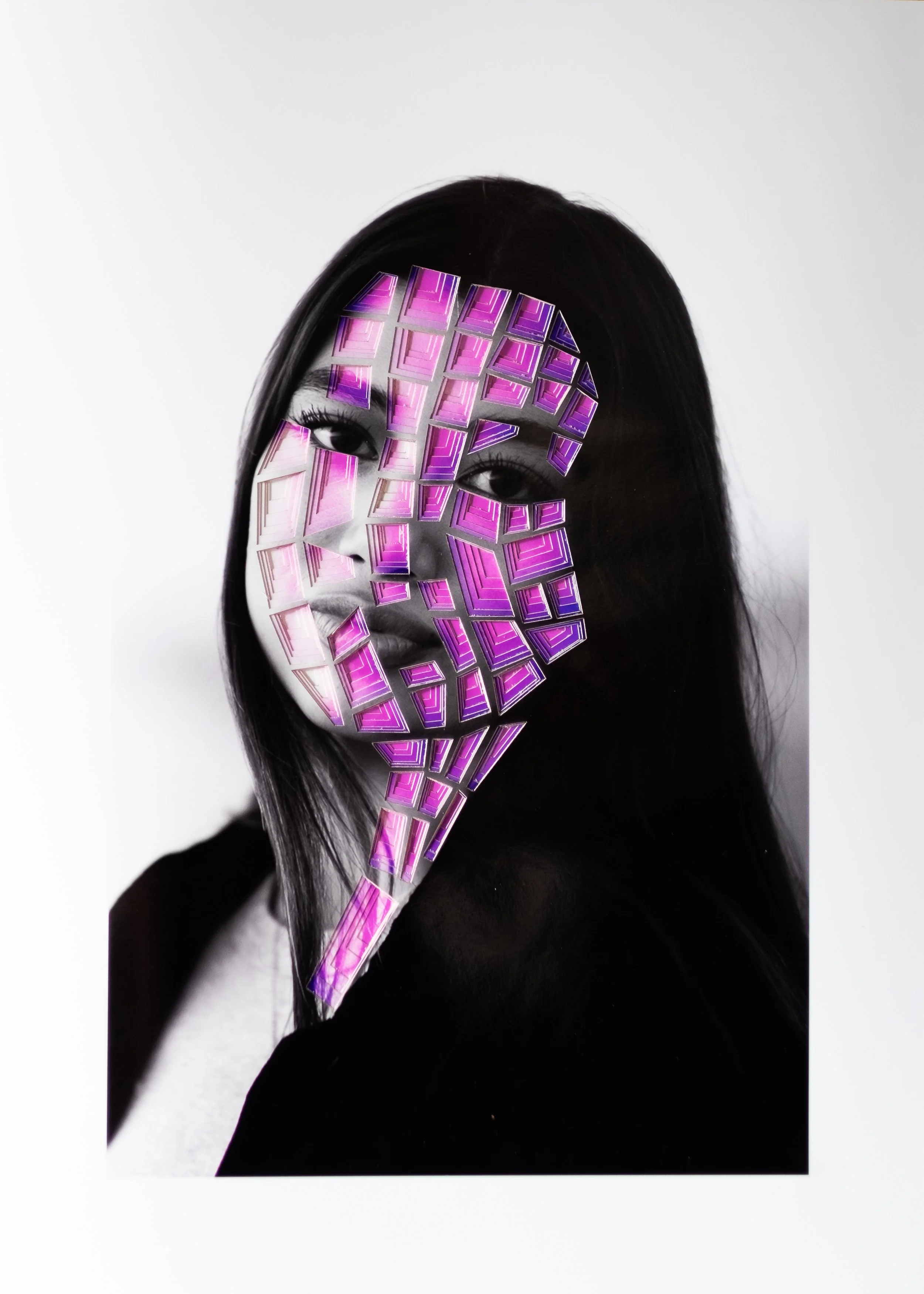 ‘Below the Surface’ explores identity beyond physical image and challenges the reality of photography through fragmentation and layering. Using various patterns and a carve-by-cutting technique, this project exposes the complex layers of identity that sit below the surface, each using an abstract pattern unique to that person. I used a laser printed and xacto knife to cut out organic and geometric patterns, covering the skin on the face and leaving a few identifying features.