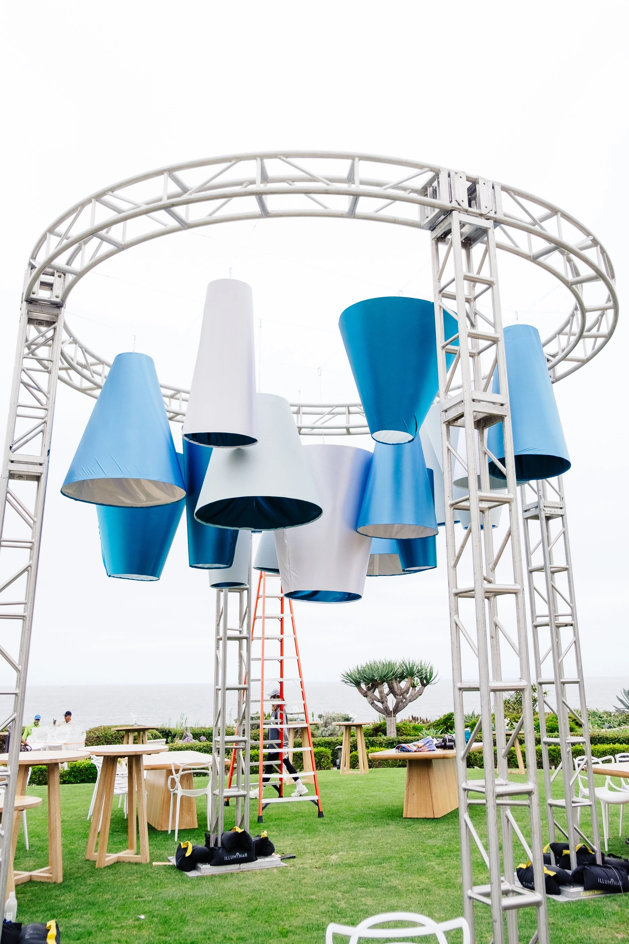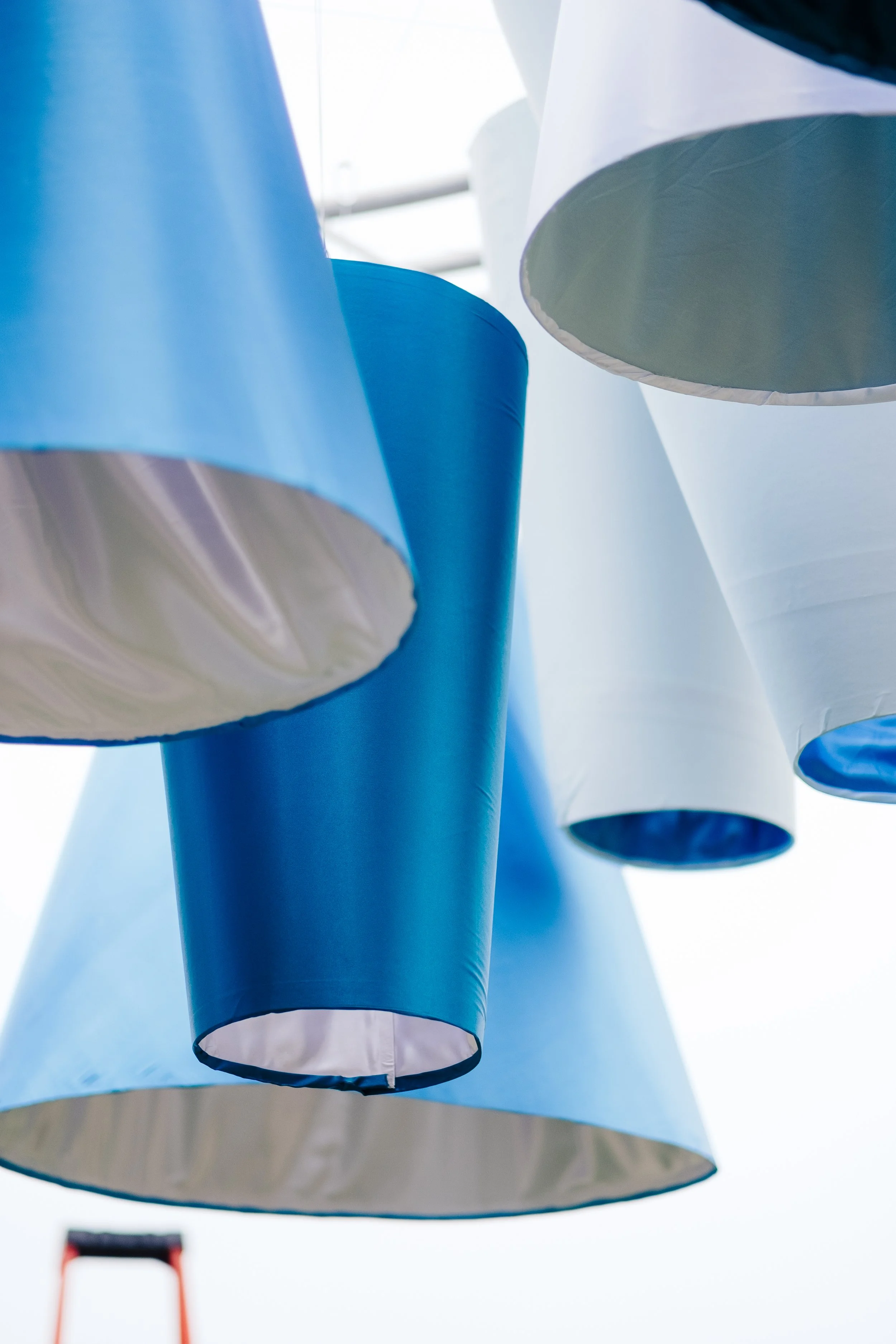 A sleek ceiling moment of satin cone shapes designed for a corporate dinner reception.