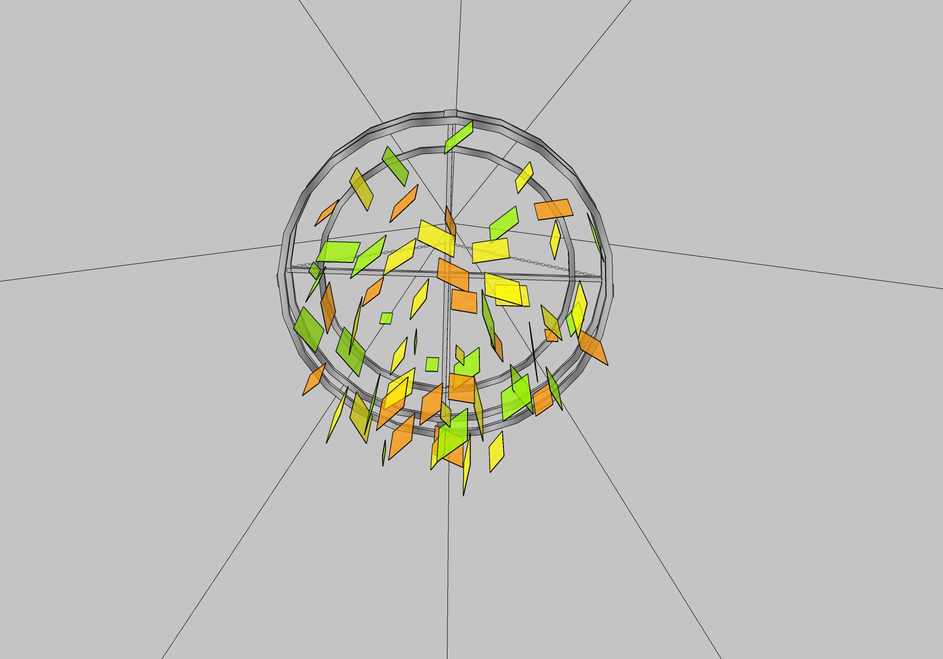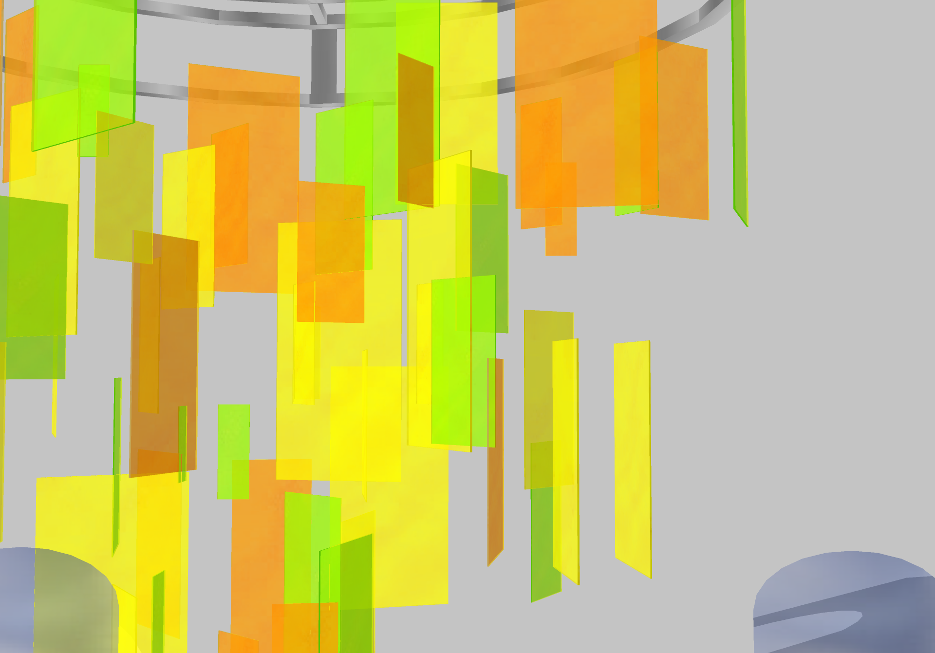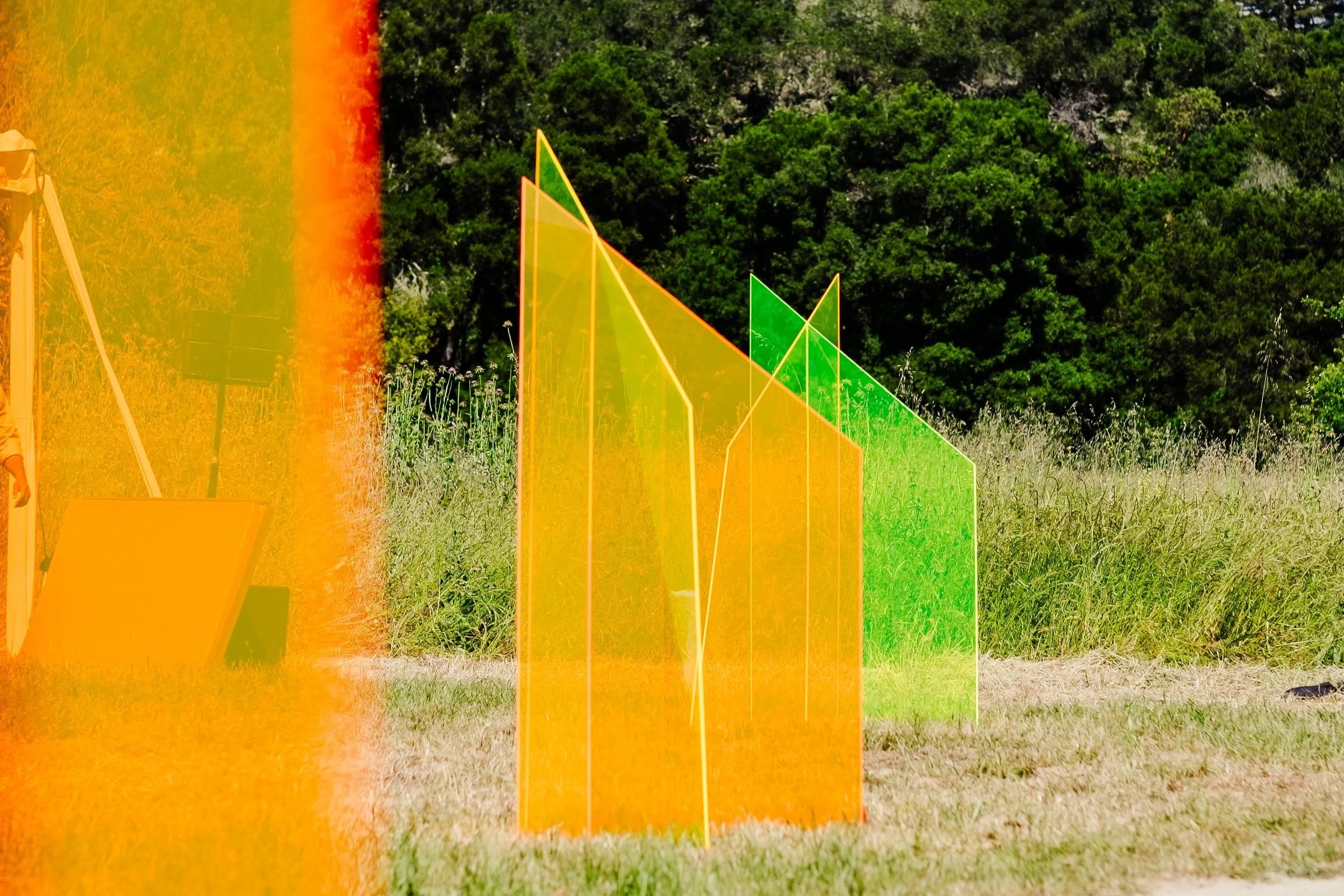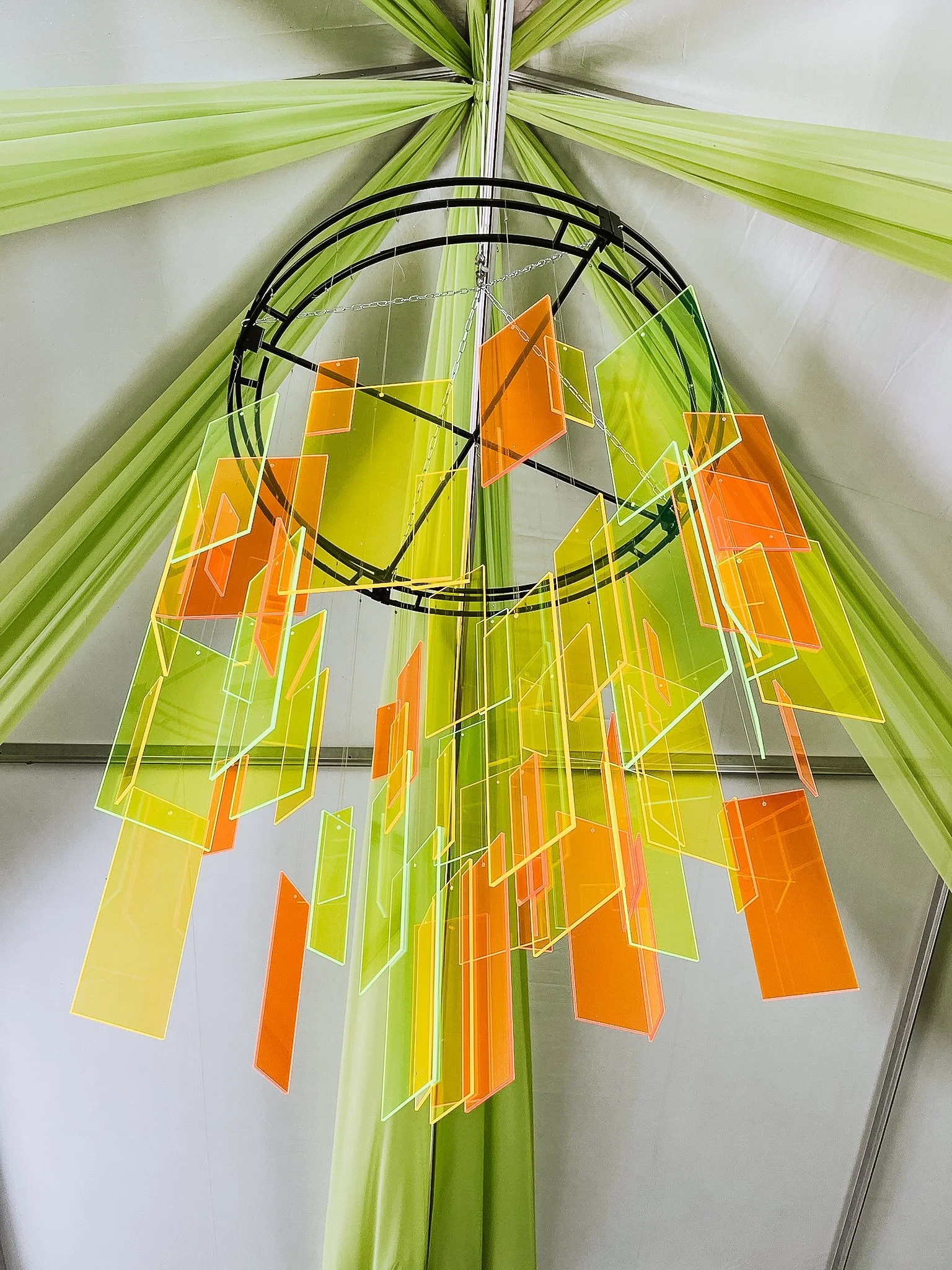 A series of colorful freestanding acrylic sculptures and a large-scale chandelier designed to contrast with the natural landscape to provide playful focal points for the event.