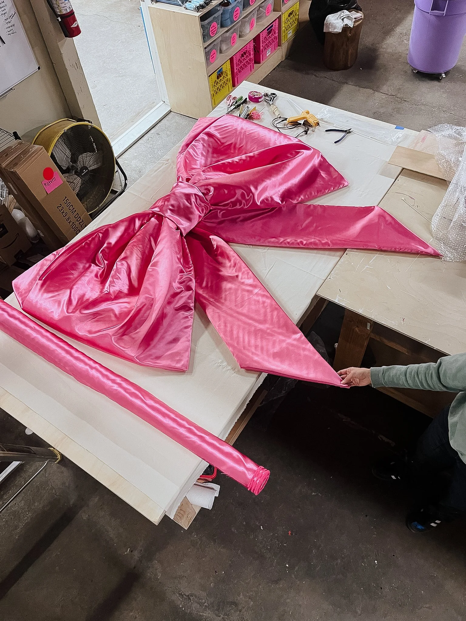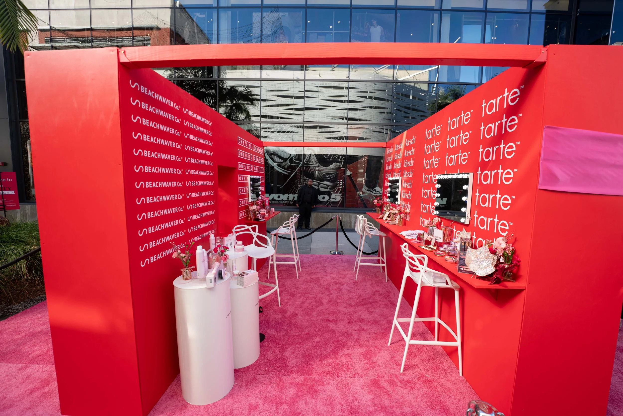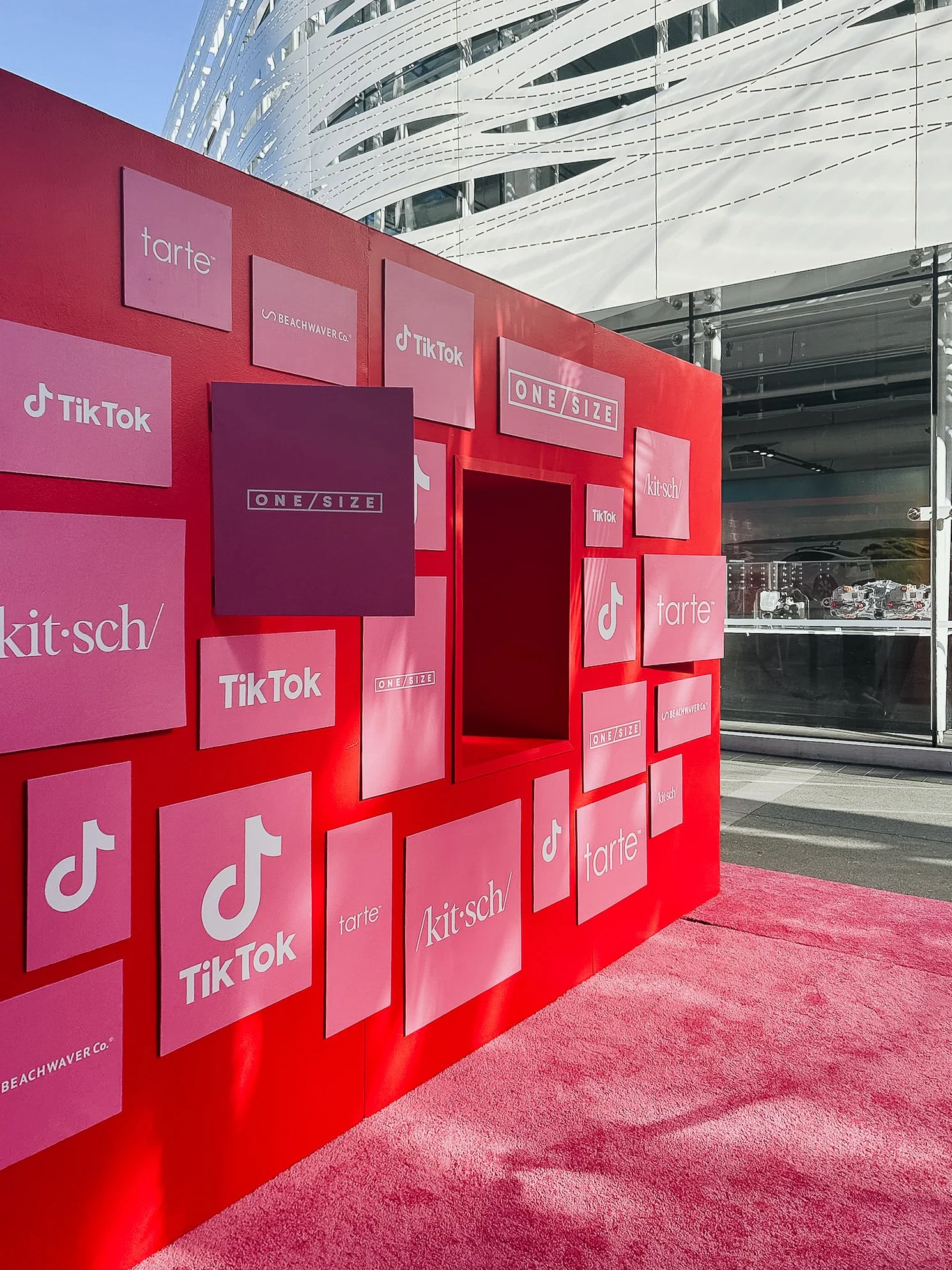 A 4-sided TikTok pop up activation that includes a life size advent calendar with hinged door cubbies to reveal gifts, an oversized satin bow, and an interior display of various brands and products.