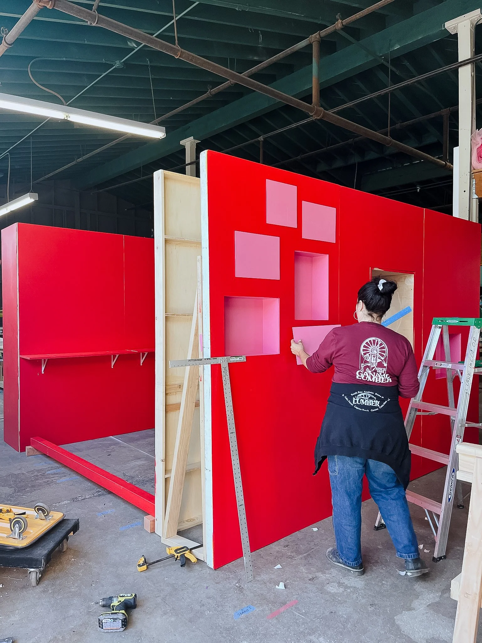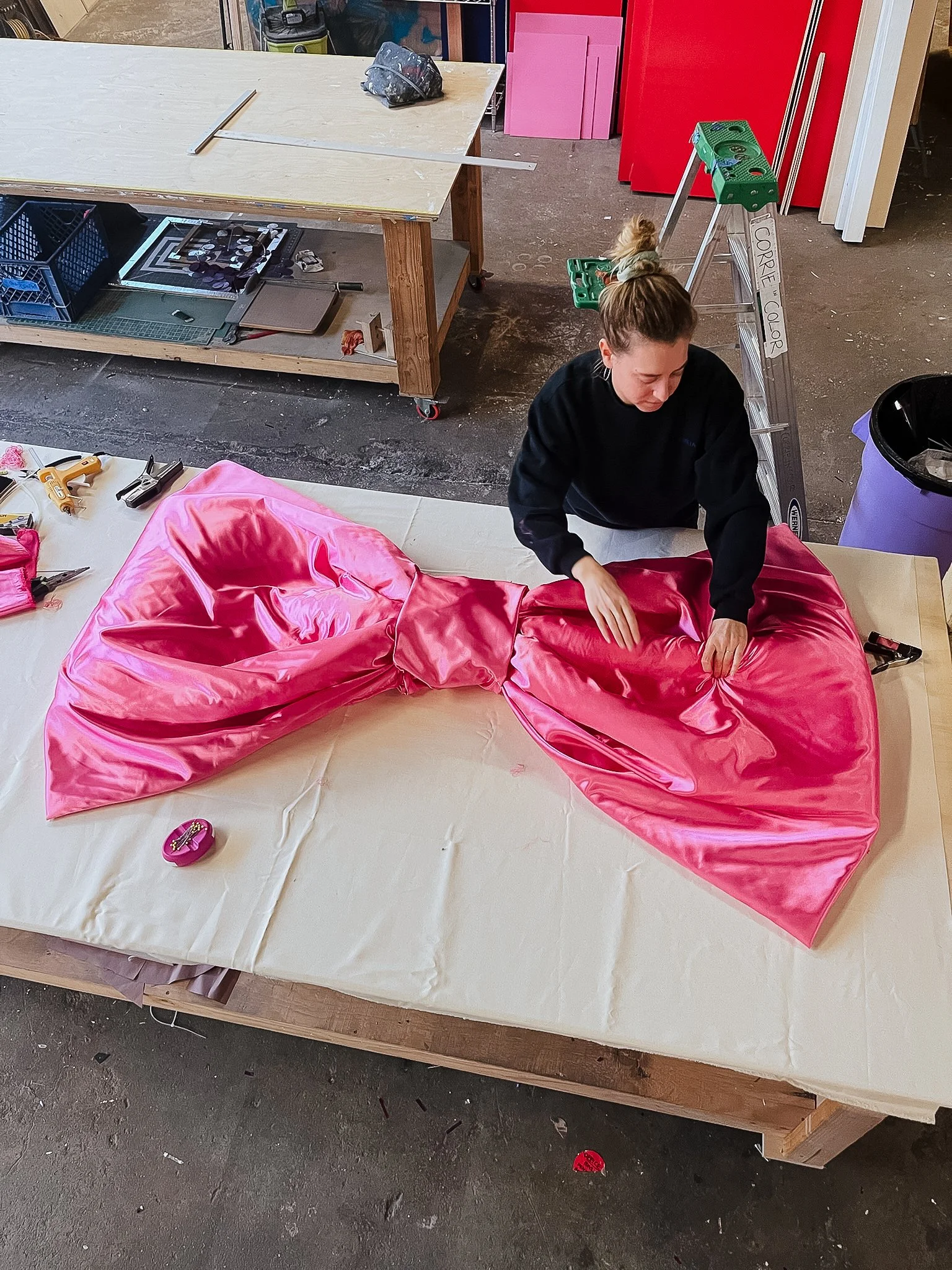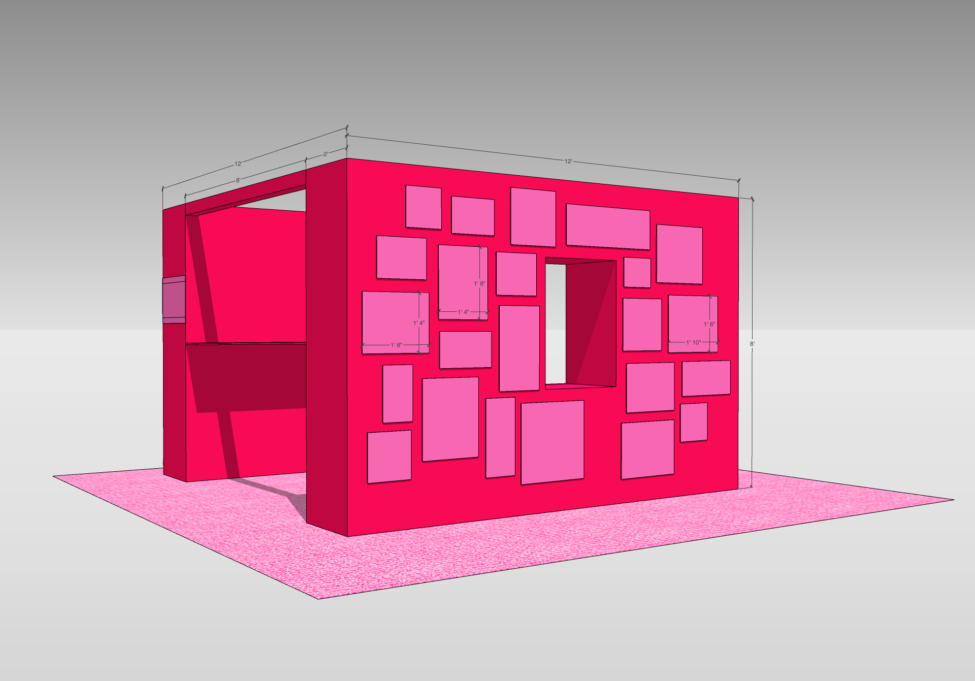 A 4-sided TikTok pop up activation that includes a life size advent calendar with hinged door cubbies to reveal gifts, an oversized satin bow, and an interior display of various brands and products.